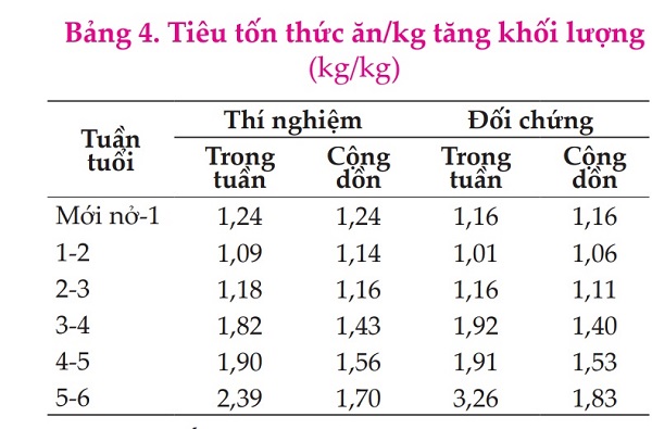 Để thấy được hiệu quả của chế phẩm Milk feed, chúng tôi đã tính tiêu tốn thức ăn/ kg tăng khối lượng của gà. Trong giai đoạn 1-3 tuần tuổi, tiêu tốn thức ăn cộng dồn của lô gà thí nghiệm luôn lớn lô đối chứng. Tuy nhiên, từ 4 đến 6 tuần tuổi, tiêu tốn thức ăn cho 1 kg tăng khối lượng trong tuần của lô gà thí nghiệm luôn thấp hơn so với đối chứng (Bảng 4). Điều đó cho thấy, chế phẩm có tác động tăng khả năng lợi dụng các dưỡng chất trong thức ăn nên gà ăn ổn định và tăng đều. Tiêu tốn thức ăn/kg tăng khối lượng cộng dồn trong kết quả nghiên cứu của chúng tôi tương dương kết quả nghiên cứu bổ sung probiotic vào khẩu phần cho gà broiler mà Nawaz và ctv (2016) công bố là 1,92-1,76 kg/kg; Liu và ctv (2012) công bố 1,81-1,72 kg/kg; Sarangi và ctv (2016) là 1,74 và lô ĐC là 1,72 kg/kg. Kết quả này cũng tương tự kết quả của Bai và ctv (2013).