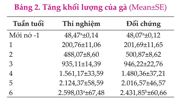 Lúc sơ sinh, khối lượng của gà ở hai lô sai khác nhau không có ý nghĩa thống kê (P>0,05). Kết thúc lúc 6 tuần tuổi, khối lượng của gà lô thí nghiệm cao hơn lô đối chứng là 166,18g, tương ứng 6,83%. Sự sai khác này có ý nghĩa thống kê (P<0,05).
