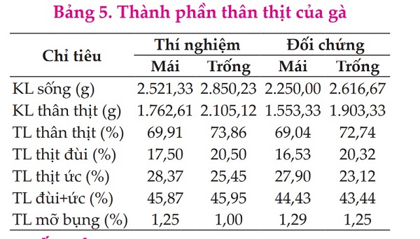 Kết thúc 42 ngày thí nghiệm, chúng tôi đã giết 6 gà/lô (03 trống và 03 mái) để xác định một số chỉ tiêu phẩm chất thân thịt. Kết quả được trình bày tại bảng 5 cho thấy: ở cùng tính biệt thì tỷ lệ thân thịt, thịt đùi, thịt ức và thịt đùi cộng ức của lô gà thí nghiệm luôn lớn hơn đối chứng, nhưng tỷ lệ mỡ lại thấp hơn lô đối chứng. Cụ thể là, thân thịt của gà mái và gà trống ở lô thí nghiệm lớn hơn lô đối chứng tương ứng như sau: tỷ lệ thân thịt là 0,51 và 1,12%; tỷ lệ thịt đùi là 0,97 và 0,82%; tỷ lệ thịt ức là 0,47 và 2,33%; tỷ lệ thịt đùi cộng ức là 1,44 và 2,51%, tỷ lệ mỡ bụng của lô thí nghiệm thấp hơn là 0,04 và 0,25%. Theo Nawaz và ctv (2016) thì bổ sung nấm men vào khẩu phần làm giảm tỷ lệ mỡ bụng thấp hơn so với đối chứng.