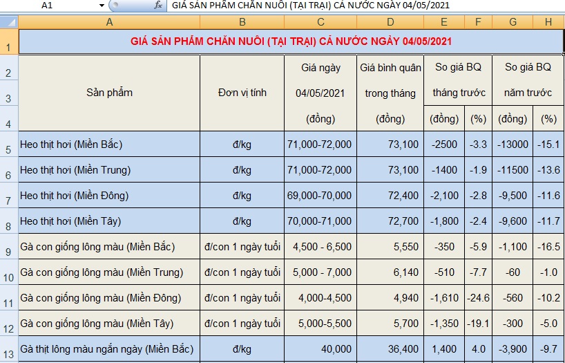 Tại thị trường trong nước, trong tháng 4/2021, giá lợn hơi biến động giảm tại các khu vực. Tại miền Bắc, giá lợn hơi giảm 1.000 – 2.000 đồng/kg so với tháng trước. Hai tỉnh Lào Cai và Phú Thọ được ghi nhận mức giao dịch thấp nhất khu vực ở mốc 71.000 đồng/kg, giảm 2.000 đồng/kg. Hai tỉnh Tuyên Quang và Nam Định lần lượt giảm 1.000 đồng/kg và 2.000 đồng/kg so với tháng trước, hiện đang thu mua chung ngưỡng 72.000 đồng/kg. Giá lợn hơi miền Bắc được ghi nhận trong khoảng 71.000 – 73.000 đồng/kg.