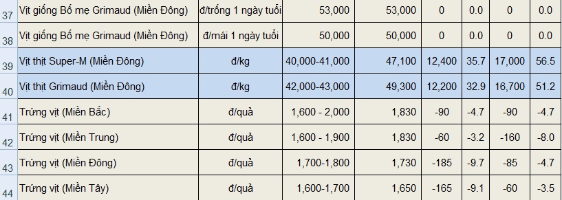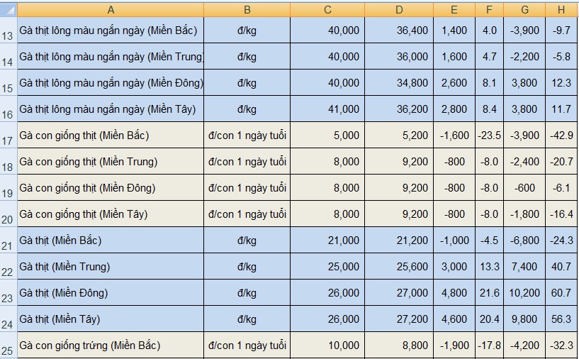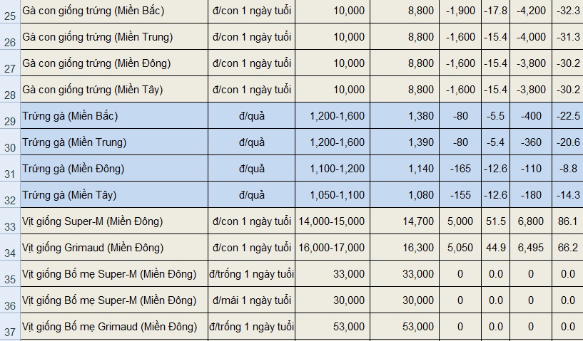 Đối với các sản phẩm gia cầm bán tại trại, giá gà thịt lông màu đều tăng nhẹ ở các địa phương, trong khi đó giá gà công nghiệp giảm nhẹ ở miền Bắc, giá trưng giữ ổn định trong tháng qua. Giá gà thịt lông màu ngắn ngày miền Bắc tăng 3.000 đồng/kg lên mức 36.000 đồng/kg. Giá gà thịt lông màu ngắn ngày miền Trung tăng 4.000 đồng/kg lên mức 36.000 đồng/kg. Giá gà thịt lông màu ngắn ngày khu vực miền Đông Nam Bộ và miền Tây Nam Bộ tăng 9.000 đồng/kg lên 36.000 – 37.000 đồng/kg. Giá gà công nghiệp miền Bắc giảm 1.000 đồng/kg xuống 21.000 đồng/kg. Giá gà công nghiệp miền Trung giữ mức 27.000 đồng/kg. Giá gà công nghiệp miền Đông và miền Tây Nam Bộ tăng 1.000 đồng/kg lên 29.000 đồng/kg. Giá trứng gà miền Bắc và miền Trung giữ ở mức 1.200 – 1.600 đồng/quả. Giá trứng gà miền Đông Nam Bộ và miền Tây Nam Bộ giảm 200 – 250 đồng/quả, hiện ở mức 950 – 1.100 đồng/quả.