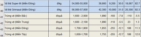 Đối với các sản phẩm gia cầm tháng qua, giá gà thịt lông màu bán tại trại giữ ổn định ở khu vực miền Bác, miền Trung và giảm ở khu vực miền Nam, trong khi giá gà 10 công nghiệp giảm đều tại cả ba miền. Cụ thể, gà thịt lông màu dài ngày miền Bắc ổn định ở mức 60.000 – 75.000 đồng/kg. Giá gà thịt lông màu dài ngày miền Trung giữ mức 47.000 – 55.000 đồng/kg. Giá gà thịt lông màu ngắn ngày khu vực miền Đông Nam Bộ và miền Tây Nam Bộ giảm 5.000 đồng/kg xuống còn 31.000 – 32.000 đồng/kg. Giá gà công nghiệp miền Bắc giảm 4.000 đồng/kg xuống 22.000 đồng/kg. Giá gà công nghiệp miền Trung giảm 3.000 đồng/kg xuống mức 20.000 đồng/kg. Giá gà công nghiệp miền Đông và miền Tây Nam Bộ giảm 3.000 đồng/kg xuống còn 19.000 - 20.000 đồng/kg. Giá trứng gà miền Bắc và miền Trung giữ ở mức 1.200 – 1.700 đồng/quả. Giá trứng gà miền Đông Nam Bộ và miền Tây Nam Bộ tăng 50 đồng/quả, hiện ở mức 1.250 – 1.350 đồng/quả.
