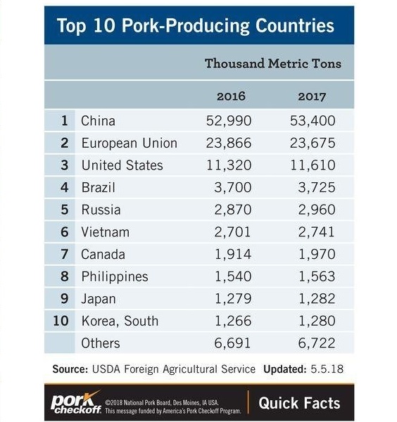 Năm 2016 và năm 2017, Việt Nam đứng thứ 6 thế giới về sản lượng thịt lợn và thứ 7 toàn cầu về số lợn giết mổ