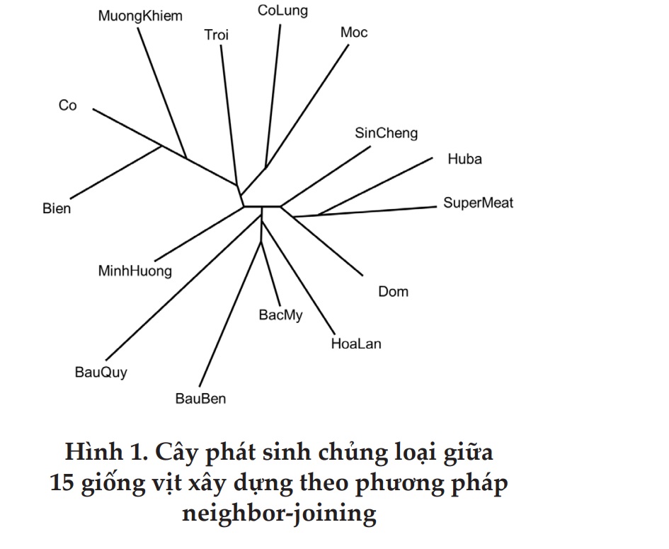 Từ dữ liệu phân tích trình tự gene D-loop, chúng tôi đã tiến hành xây dựng thành công cây phát sinh chủng loại giúp minh họa mối quan hệ di truyền của 15 giống vịt nghiên cứu (Hình 1).