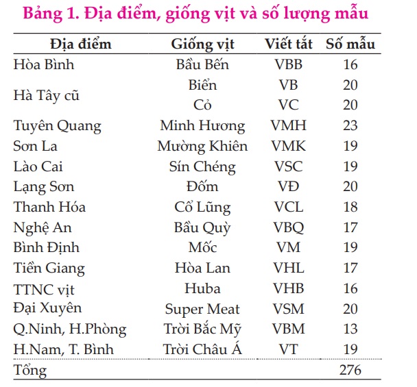 Thực hiện trên 15 giống vịt, được thu thập từ các vùng địa lý khác nhau trên lãnh thổ Việt Nam bao gồm: Hòa Bình, Hà Tây cũ, Hà Nam, Thái Bình, Tuyên Quang, Sơn La, Lào Cai, Lạng Sơn, Thanh Hóa, Nghệ An, Bình Định, Tiền Giang, Hải Phòng và Quảng Ninh (Bảng