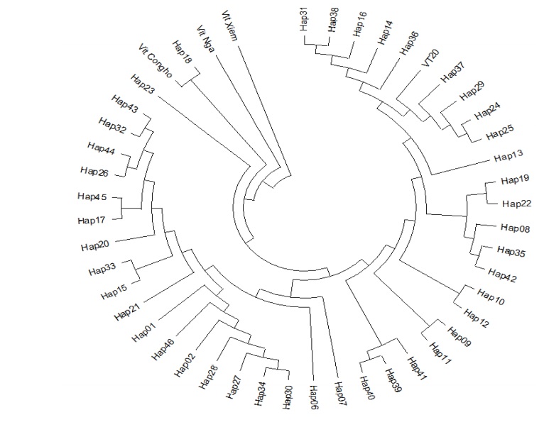 Kết quả phân tích cho thấy mức độ đa dạng các haplotype ở các giống vịt bản địa Việt Nam khá cao, nghiên cứu đã xác định được tổng cộng 44 haplotype khác nhau trên 15 giống vịt phân tích. Trình tự 44 haplotype của 15 giống vịt trong nghiên cứu này được so sánh với 14 trình tự trên ngân hàng gen của một số giống vịt: Trung Quốc (EF126702, EF126731, EU755252.1 và KJ833586.1); Hàn Quốc (KU845272, KU845299); Indonesia (KX756168, KX712255); Thái Lan (EU013948, EU013952); Cộng Hòa Séc (JN811041), Viễn Đông Nga (AY506947) và Ngan (vịt Xiêm Cairina moschata EU755254).