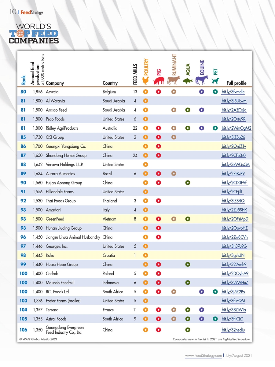 [Hội Chăn nuôi Việt Nam] - Danh sách này thống kê các doanh nghiệp thức ăn chăn nuôi có sản lượng trên 1 triệu tấn trên toàn thế giới. Việt Nam có 2 doanh nghiệp lọt top này là Masan MEATLife (đứng ở vị trí thứ 56, sản lượng 2,5 triệu tấn) và GREENFEED (vị trí thứ 93 với sản lượng 1,5 triệu tấn).