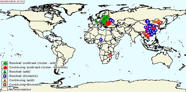 Hình 2: Tình hình bệnh Dịch tả lợn châu Phi trên thế giới từ 01/01/2019-01/03/2019 (nguồn OIE)