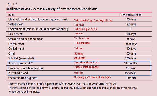 ASFV chủ yếu gây nhiễm vào đại thực bào của lợn và gây ra dịch bệnh nghiêm trọng cho đàn lợn nuôi và lợn rừng. Virus này có khả năng tồn tại lâu dài trong máu, các mô bào và những sản phẩm thịt sống hoặc nấu không chín kỹ. Do vậy, nếu xảy ra bệnh sẽ rất khó để loại trừ được mầm bệnh. ASFV bị vô hoạt ở nhiệt độ 60oC trong 20 phút, pH=11,5 hoặc bằng những hóa chất sát trùng thông dụng như ête, chloroform, NaOH 0,8%, clorin 3%, formalin 0,3%. Chi tiết về sức đề kháng của virus có thể xem tại bảng 1.