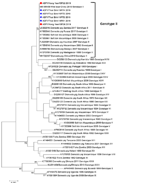 Ngay sau khi xét nghiệm các mẫu bệnh phẩm của lợn bệnh tại các tỉnh Hưng Yên, Thái Bình có kết quả dương tính đối với bệnh Dịch tả lợn Châu Phi bằng nhiều phương pháp (như PCR truyền thống, Real-time PCR, ELISA), Cục Thú y đã chỉ đạo Chi cục Thú y vùng VI tiến hành giải trình tự gien (vùng gien p72) của các mẫu vi rút Dịch tả lợn Châu Phi tại Việt Nam.