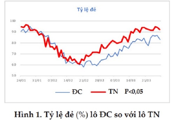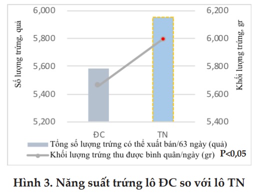 Tổng số trứng thu được sau 70 ngày TN cũng khác biệt đáng kể giữa 2 lô, sự khác biệt này có ý nghĩa về mặt thống kê với P<0,05. Cụ thể, số trứng thu được từ lô TN là 5.955 quả, còn lô TN là 5.580 quả trứng. Điều đó thể hiện sức khoẻ đàn gà tốt, TLĐ cao và ổn định sẽ làm tăng lượng trứng thu được, có tác dụng đáng kể đến hiệu quả kinh tế trong chăn nuôi (Hình 3).