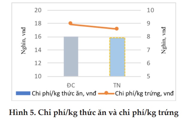 Nếu tính giá bột cá (protein 60%) tại thời điểm TN là 25.000 vnđ/kg và giá protein tôm thủy phân là 20.000 vnđ/kg thì chi phí TA lô TN có giá thành là 7.915 vnđ/kg, giảm 100 đồng so với thức ăn ĐC (8.015 vnđ/kg). Ngoài ra, tính trên chi phí TA để sản xuất ra 1kg trứng thành phẩm, lô TN là 17,097 vnđ, giảm được 777 vnđ/kg so với lô ĐC là 17,874 vnđ (Hình 5). Vì thế, nếu xét trên chi phí để sản xuất ra 1kg trứng thì sử dụng đạm tôm thuỷ phân đem lại hiệu quả kinh tế hơn cho người chăn nuôi gà đẻ.