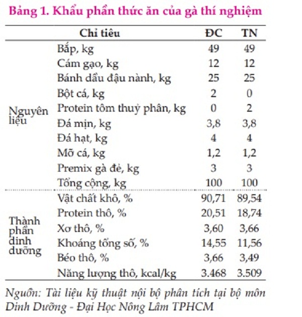 Khi thực hiện TN, do thay thế 2% bột cá trong khẩu phần TN bằng 2% protein tôm thuỷ phân đã làm cho thành phần dinh dưỡng của TA TN có thay đổi so với TA ĐC, cụ thể hàm lượng protein thô trong khẩu phần giảm từ 20,51% ở lô ĐC xuống còn 18,74% ở lô TN, tuy nhiên, TLĐ lô TN cao hơn so với lô ĐC. Điều này có thể do tỷ lệ tiêu hoá thức ăn tăng lên, khẩu phần TA TN có chứa các thành phần protein đã được thuỷ phân thành các peptide có cấu trúc ngắn nên dễ tiêu hoá và hấp thu hơn đồng thời lượng protein hấp thu triệt để hơn, phù hợp cho gà trong giai đoạn sức khoẻ giảm, tỷ lệ tiêu hoá hấp thu cao, giúp gà vượt qua giai đoạn bệnh dễ dàng hơn so với gà ăn khẩu phần thức ăn ĐC.