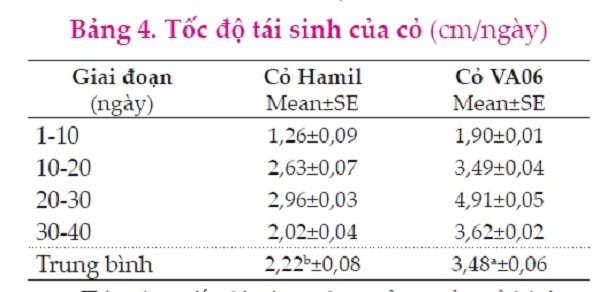 Số liệu bảng 4 cho thấy, tốc độ tái sinh trưởng chậm nhất ở giai đoạn 1-10 ngày ở cả hai giống cỏ. Tốc độ tái sinh trưởng của cỏ bắt đầu tăng lên ở giai đoạn 10-20 ngày, đạt ngưỡng cao nhất ở 20-30 ngày và có xu hướng giảm dần ở giai đoạn 30-40 ngày. Trung bình tốc độ tái sinh trưởng của cỏ Hamil ở tất cả các giai đoạn đạt 2,22cm, thấp hơn cỏ VA06 đạt 3,48cm (P<0,05). Nhìn chung, tốc độ tái sinh trưởng của hai giống cỏ đều tuân theo quy luật sinh trưởng chung. Theo Nguyễn Thị Thúy Hằng và ctv (2013), tốc độ sinh trưởng của cỏ Hamil ở lứa cắt tái sinh trung bình là 2,50cm và của cỏ VA06 đạt 4,14cm (Nguyễn Thị Hòa Bình và ctv, 2017).