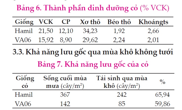 Khả năng lưu gốc qua mùa khô không tưới của cỏ Hamil là 65,94%, cỏ VA06 là 59,86%.