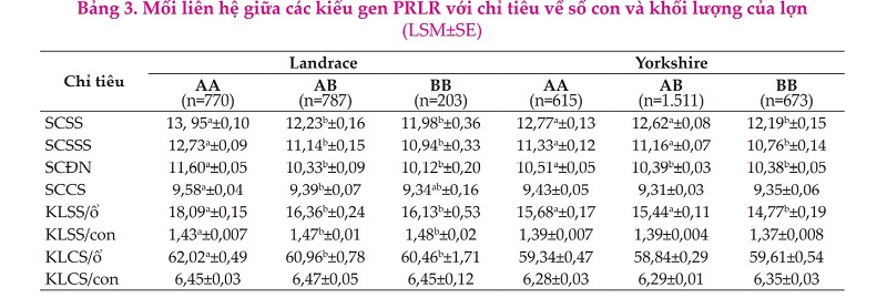 Kết quả về mối quan hệ giữa các kiểu gen của gen PRLR với một số chỉ tiêu về khả năng sinh sản được trình bày ở bảng 3 cho thấy gen PRLR cũng có ảnh hưởng tới các chỉ tiêu về số con/ổ ở cả lợn nái Landrace và Yorkshire. Kiểu gen AA và AB có ảnh hưởng tích cực so với kiểu gen BB (P<0,05), chỉ tiêu SCSS ở lợn Landrace của ba kiểu gen AA, AB và BB lần lượt là 13,95, 12,23 và 11,98 con, ở Yorkshire lần lượt là 12,77, 12,62 và 12,11 con. Với chỉ tiêu SCSSS của ba kiểu gen trên ở lợn Land[1]race lần lượt là 12,73, 11,14 và 10,94 con, và ở Yorkshire lần lượt là 11,33, 11,16 và 10,76 con. Chỉ tiêu SCCS gen PRLR có ảnh hưởng ở lợn Landrace nhưng không ảnh hưởng ở lợn Yorkshire. Các nghiên cứu đã công bố cũng cho biết kiểu gen PRLR cũng có ảnh hưởng đến các chỉ tiêu số con ở lợn nái. Mencik và ctv (2015) cho biết gen PRLR có ảnh hưởng tới SCSS ở lứa 1, SCSSS ở lứa 3 và tính chung các lứa thì gen này chỉ ảnh hưởng tới chỉ tiêu SCSSS và nó đạt cao nhất ở những cá thể mang kiểu gen AA. Barreras và ctv (2009) cho biết gen PRLR có ảnh hưởng tới các chỉ tiêu số con ở lợn Duroc, Landrace và Yorkshire. Ở lợn Duroc kiểu gen AA (10,50) và kiểu gen BB (9,25) tốt hơn hiểu gen AB (5,83). Ở lợn Land[1]race và Yorkshire lại không có sai khác giữa kiểu gen AA và kiểu gen AB. Tương tự với chỉ tiêu KLSS/ổ cũng không có sự sai khác giữa các kiểu gen PRLR. Terman và ctv (2017) cho biết gen PRLR chỉ có ảnh hưởng ở lứa 1 với các chỉ tiêu số con ở lợn nái Polish Large White, cao nhất là kiểu gen AA với chỉ tiêu SCSS là 10,02, SCSSS là 9,93 con và SCCS là 9,61 con/ổ.
