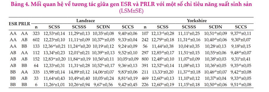 Ảnh hưởng tương tác giữa giữa 2 gen ESR và PRLR đến một số chỉ tiêu về sinh sản của lợn Landrace và Yorkshire được trình bày ở bảng 4 cho biết các chỉ tiêu SCSS chịu ảnh hưởng của sự tương tác giữa hai gen ESR và PRLR. Đặc biệt, những cá thể mang kiểu gen đồng hợp ESRBBPRLRAA của hai locus này có thành tích cao nhất ở cả hai giống lợn Landrace (15,98 con) và Yorkshire (13,33 con). Đây là tổ hợp gen đồng hợp cả hai locus và rất có ý nghĩa trong nhân giống. SCSSS của kiểu gen này cũng là cao nhất ở lợn Landrace là 14,89 con và lợn Yorkshire là 11,37 con.