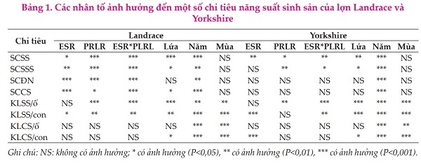 Kết quả phân tích ảnh hưởng của ESR, PRLR, lứa, năm và mùa vụ đến một số chỉ tiêu năng suất sinh sản ở lợn Landrace và Yorkshire được trình bày ở bảng 1 cho thấy gen ESR, gen PRLR và sự tương tác của hai gen này đều có ảnh hưởng tới các chỉ tiêu số con ở lợn Landrace. Nhưng nó chỉ ảnh hưởng tới chỉ tiêu SCSS và SCSSS ở lợn Yorkshire. Yếu tố năm có ảnh hưởng tới tất cả các chỉ tiêu. Yếu tố mùa vụ không có ảnh hưởng tới chỉ tiêu số con nhưng lại có ảnh hưởng tới các chỉ tiêu khối lượng. Yếu tố lứa có ảnh hưởng tới chỉ tiêu SCSS và KLSS.
