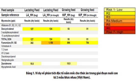 Bảng 1 đưa ra ví dụ về phân tích cho thức ăn giống nhau trong giai đoạn nuôi con (cùng một mẻ) trong trại heo ở Việt Nam. Mẫu thức ăn được lấy ở những nơi khác nhau trong cùng 1 trang trại: mẫu 1 từ bao; mẫu 2 từ máng ăn.