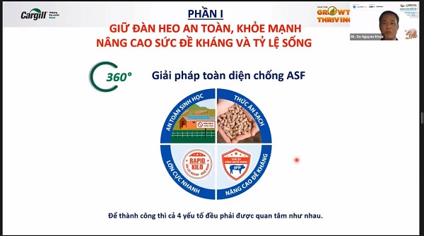 Theo ông Khoa, có 2 vấn đề mấu chốt nhà chăn nuôi cần lưu ý: (1). Giữ đàn heo an toàn, khỏe mạnh, nâng cao sức đề kháng và tỷ lệ sống. Sau ASF, Cargill đã và đang áp dụng bộ giải pháp toàn diện đó là: đảm bảo an toàn sinh học, thức ăn sạch, nâng cao sức đề kháng và lớn cực nhanh. Các yếu tố này đều được quan tâm như nhau nếu muốn thành công (2). Tăng năng suất, giảm giá thành. Đây là mục tiêu của người chăn nuôi dù khi giá heo tốt và không tốt, chỉ có vậy mới có thể cạnh tranh được. Bởi khi giá heo tốt, nhà chăn nuôi sẽ tối đa hóa lợi nhuận, còn khi giá thấp thì nhà chăn nuôi sẽ lỗ ít hoặc có lợi nhuận, dù nhỏ để vượt qua khó khăn.