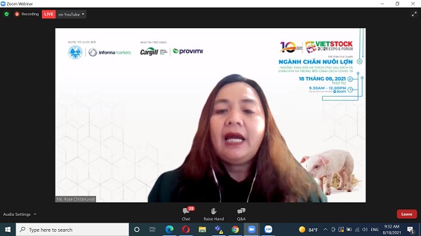 Phát biểu khai mạc, bà Rose Chitanuwat, Giám đốc Chuỗi dự án (ASEAN), Công ty Informa Markets Thái Lan đã gửi lời cảm ơn đến Hội chăn nuôi Việt Nam, Nhà tài trợ vàng Cargill Việt Nam cùng toàn thể quý vị khán giả đã tham dự hội thảo trực tuyến. Bà Rose mong rằng, hội thảo sẽ cập nhật những kiến thức, thông tin bổ ích về ngành chăn nuôi lợn và đặc biệt là trong bối cảnh đại dịch Covid-19 đang là mối lo âu rất lớn đối với các doanh nghiệp và hộ chăn nuôi Việt Nam. Bên cạnh đó, bà cũng mong rằng Ban tổ chức Vietstock sẽ có nhiều hơn nữa những hội thảo chuyên đề với các chuyên gia hàng đầu trong ngành chăn nuôi trong thời gian sắp tới.