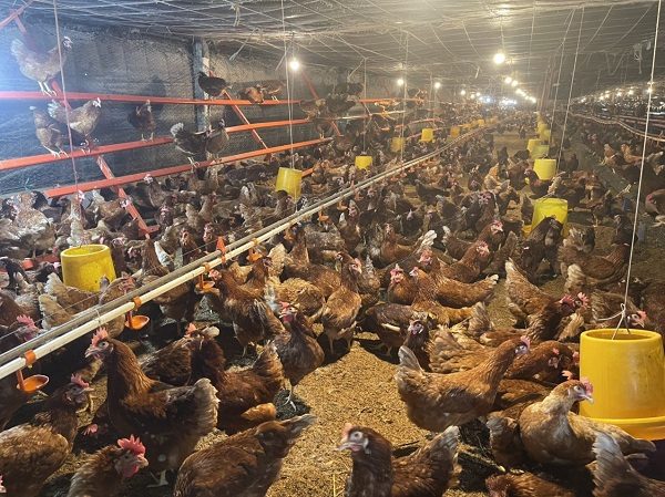 Trang trại Năm Hưởng với đầy đủ sào đậu, ổ đẻ, chất độn chuồng- Ảnh: Năm Hưởng
