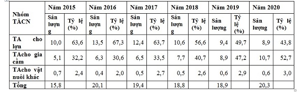 + Năm 2020: Thức ăn chăn nuôi cho lợn chiếm 43,8%, Thức ăn chăn nuôi cho gia cầm chiếm 52,7%.