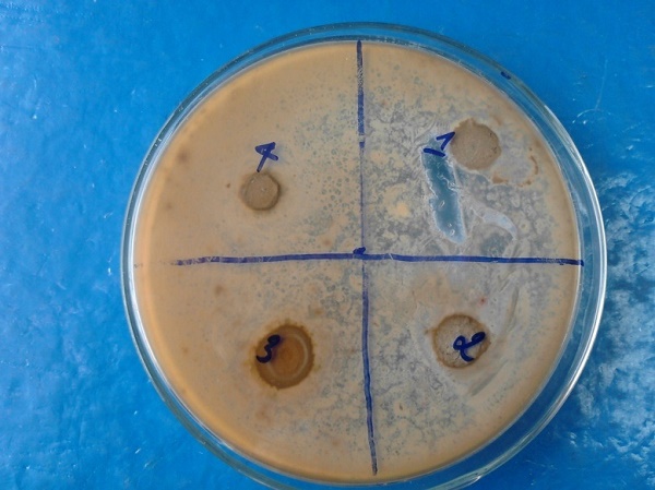 Hình ảnh thử nghiệm vòng kháng khuẩn (A) và hạn chế sự phát triển của nấm (B) của Bentonit gắn nano Ag.