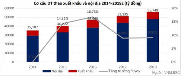 Cùng với đó, 6 tháng đầu năm 2018 doanh thu xuất khẩu vẫn tiếp tục giảm 6.8% so với cùng kỳ. Lý giải điều này, BSC cho rằng thị phần đặc biệt giảm đáng kể là thị trường Trung Đông khi nhà phân phối Dubai chủ động cắt giảm nhập khẩu vì thị trường Iraq gặp khó khăn kinh tế (chiếm khoảng 60% doanh thu xuất khẩu).