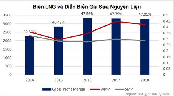 Đối với chi phí sữa nguyên kem và tách béo (chiếm tỷ trọng cao khoảng 40-50% trong cơ cấu chi phí nguyên vật liệu), theo hợp đồng tương lai giá sữa nguyên vật liệu của Fonterra New Zealand vào tháng 12/2018, giá sữa WMP có thể giảm 8,45% so với quý trước về mức 2.952 USD/tấn, sữa SMP giảm nhẹ 2,15% so với quý trước về mức 2.007 USD/tấn.