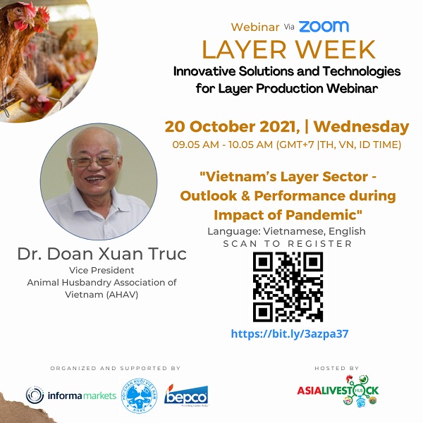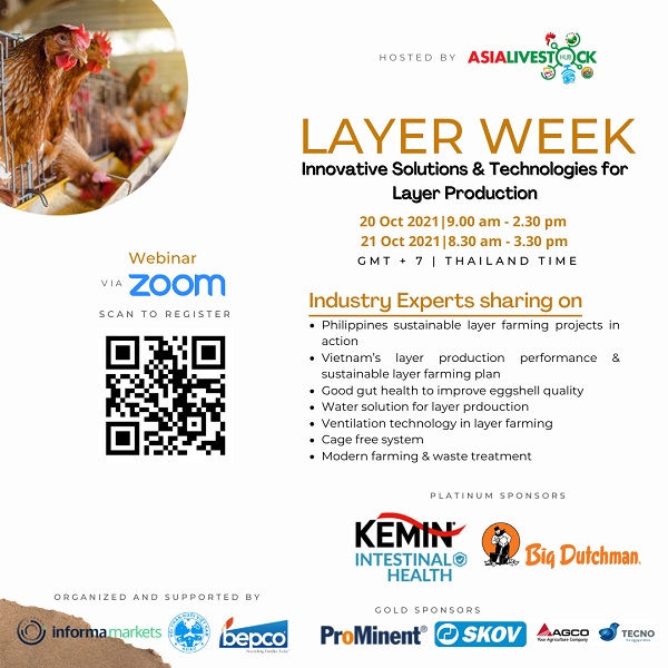 Công ty Informa Markets cùng với Hội Chăn nuôi Việt Nam (AHAV) và Hợp tác xã các Nhà Sản xuất trứng Batangas (BEPCO) trân trọng kính mời Quý đại biểu tham dự Hội thảo Online trực tuyến Tuần lễ Gia cầm – sự kiện đặc biệt xoay quanh các giải pháp và công nghệ tiên tiến trong ngành chăn nuôi gia cầm lấy trứng, sẽ tổ chức trong 2 ngày (20 – 21/10/2021).