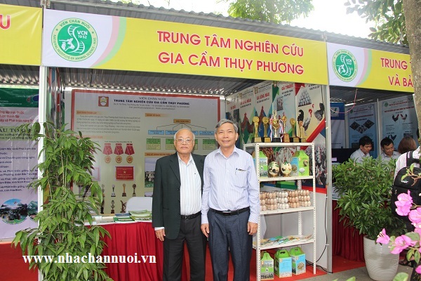 Lãnh đạo Hội Chăn nuôi Việt Nam chụp ảnh lưu niệm với lãnh đạo Trung tâm Nghiên cứu gia cầm Thụy Phương tại gian hàng của Trung tâm.