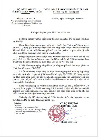 Vì vậy, “Để ngăn ngừa bệnh Dịch tả lợn châu Phi xâm nhập vào Việt Nam làm lây lan dịch bệnh cho đàn lợn nuôi trong nước, Bộ NN&PTNT trân trọng thông báo tới Đại sứ quán Thái Lan tại Hà Nội về việc Việt Nam tạm ngừng nhập khẩu lợn sống để giết mổ làm thực phẩm từ Thái Lan kể từ ngày 30/6/2021.