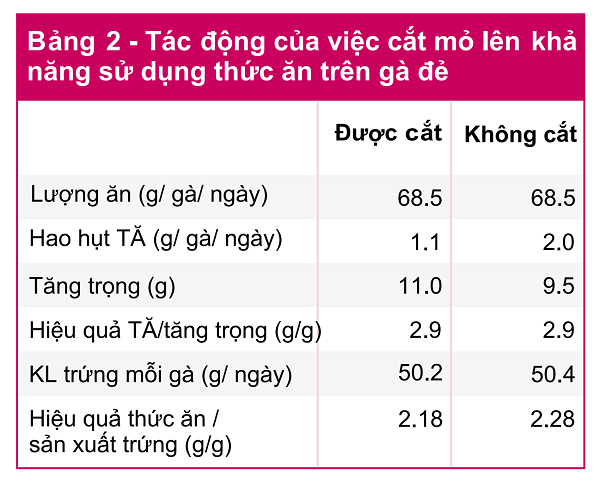 Phần mỏ dài giúp gà có thể chơi đùa với thức ăn, nhưng một khi thức ăn rơi trên sàn chuồng và lẫn với chất độn chuồng thì gà sẽ không ăn. Việc cắt tỉa mỏ đúng cách là điều cần thiết để giảm bớt những vấn đề này, ngoài ra còn có những ưu điểm như giảm bớt cắn mổ đồng loại và các tập tính không tốt khác. Kết quả nghiên cứu tác động của của việc cắt mỏ gà liên quan đến khả năng sử thức ăn và lượng thức ăn hao hụt được trình bày ở bảng 2. Tuy nhiên, kết quả này có thể thay đổi rất nhiều tùy thuộc vào các yếu tố như độ tuổi khi cắt mỏ, cách cắt tỉa, mức độ nghiêm trọng khi cắt, nhiệt độ của lưỡi dao…